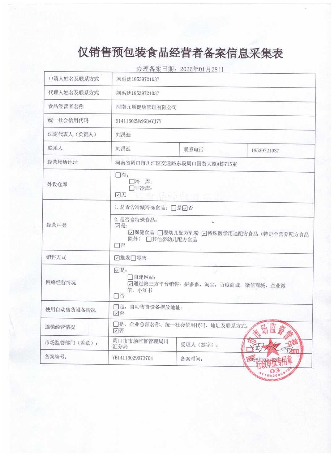 - 一般项目:健康咨询服务(不含诊疗服务);中医养生保健服务(非医疗);第一类医疗器械销售;第二类医疗器械销售;消毒剂销售(不含危险化学品);个人卫生用品销售;食用农产品零售,日用百货销售;化妆品零售:日用家电零售,互联网销售(除销售需要许可的商品);技术服务、技术开发、技术咨询、技术交流、技术转让、技术推广;广告制作:食品互联网销售(仅销售预包装食品);食品销售(仅销售预包装食品);广告发布;保健食品(预包装)销售;会议及展览服务(出国办展须经相关部门审批);特殊医学用途配方食品销售(除依法须经批准的项目外,凭营业执照依法自主开展经营活动)